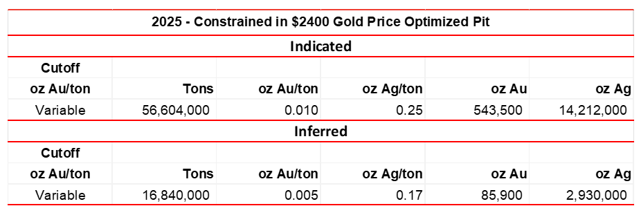 RESPEC Company, LLC utilized the approximate 3-year trailing-average, base-case price of US$2,400 per ounce of gold and $28.80 per ounce of silver to update the pit-constrained resource tabulated below.